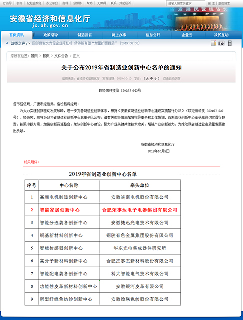 近日,安徽省經(jīng)信委公布了2019年度省制造業(yè)創(chuàng )新中心名單,由合肥榮事達電子電器集團有限公司牽頭申報的“智能家居創(chuàng )新中心”成功入選。