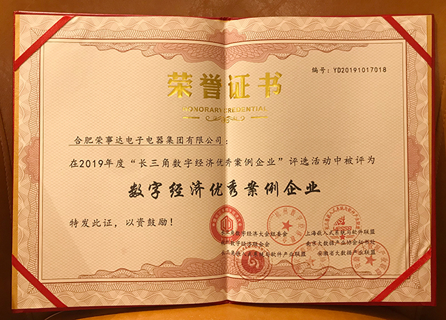 10月17日,2019中國國際嵌入式大會(huì )暨首屆中國長(cháng)三角數字經(jīng)濟大會(huì )在杭州舉行。大會(huì )期間,合肥榮事達電子電器集團有限公司憑借智能家居全價(jià)值鏈創(chuàng )新創(chuàng )業(yè)生態(tài)發(fā)展,榮獲“長(cháng)三角數字經(jīng)濟優(yōu)秀案例企業(yè)”稱(chēng)號。