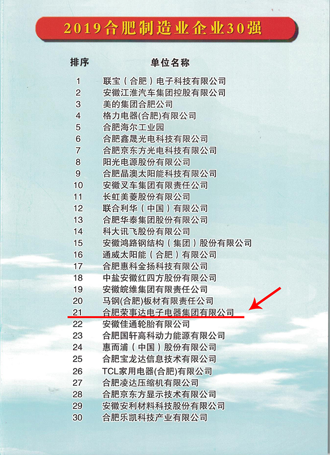 合肥榮事達電子電器集團有限公司榮登2019合肥企業(yè)50強、2019合肥制造業(yè)企業(yè)30強榜單。