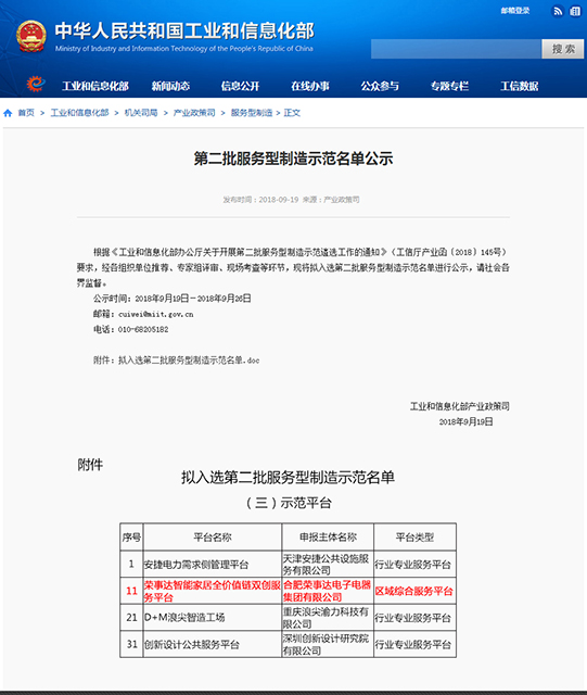 2018年9月,工信部發(fā)布了2018年服務(wù)型制造示范名單。合肥榮事達電子電器集團有限公司在培育傳統產(chǎn)業(yè)新業(yè)態(tài)、新模式,獲得轉型升級發(fā)展過(guò)程中,重點(diǎn)打造的區域綜合性服務(wù)平臺——“榮事達智能家居全價(jià)值鏈雙創(chuàng )服務(wù)平臺”,獲評2018年服務(wù)型制造示范平臺。