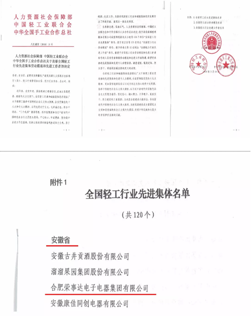 2018年3月,合肥榮事達電子電器集團有限公司被人社部、中國輕工業(yè)聯(lián)合會(huì )、及中華全國手工業(yè)合作總社聯(lián)合評為“全國輕工行業(yè)先進(jìn)集體”。
