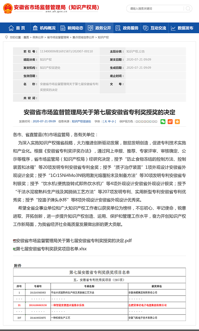日前,安徽省市場(chǎng)監管局官網(wǎng)上發(fā)布了《關(guān)于第七屆安徽省專(zhuān)利獎授獎的決定》,合肥榮事達電子電器集團有限公司的“一種智能坐便器水箱排水系統”獲省專(zhuān)利優(yōu)秀獎。