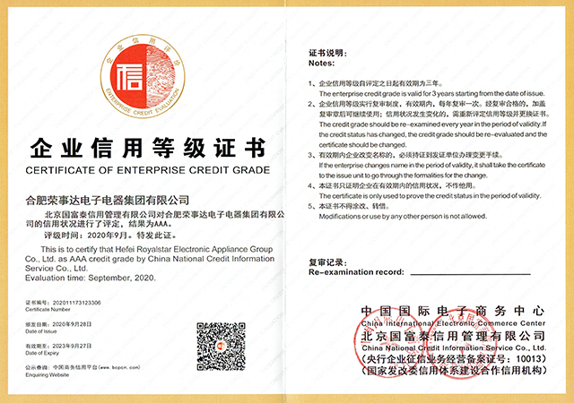 近日,商務(wù)部中國國際電子商務(wù)中心、北京國富泰信用管理有限公司聯(lián)合發(fā)布信用評價(jià)等級評定結果:合肥榮事達電子電器集團有限公司獲評“AAA”級信用企業(yè)。