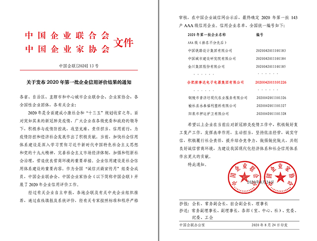 此次獲評最高信用等級——“AAA”級信用企業(yè),是榮事達電子電器集團今年第二次獲此殊榮,此前,中國企業(yè)聯(lián)合會(huì )、中國企業(yè)家協(xié)會(huì )聯(lián)合評定我司為2020年第一批AAA級信用企業(yè)。這些榮譽(yù),是對榮事達電子電器集團多年來(lái)不斷努力、誠信經(jīng)營(yíng)的最大認可,更是對榮事達電子電器集團管理水平、盈利能力、行業(yè)聲譽(yù)以及信用記錄等方面情況的極大肯定。