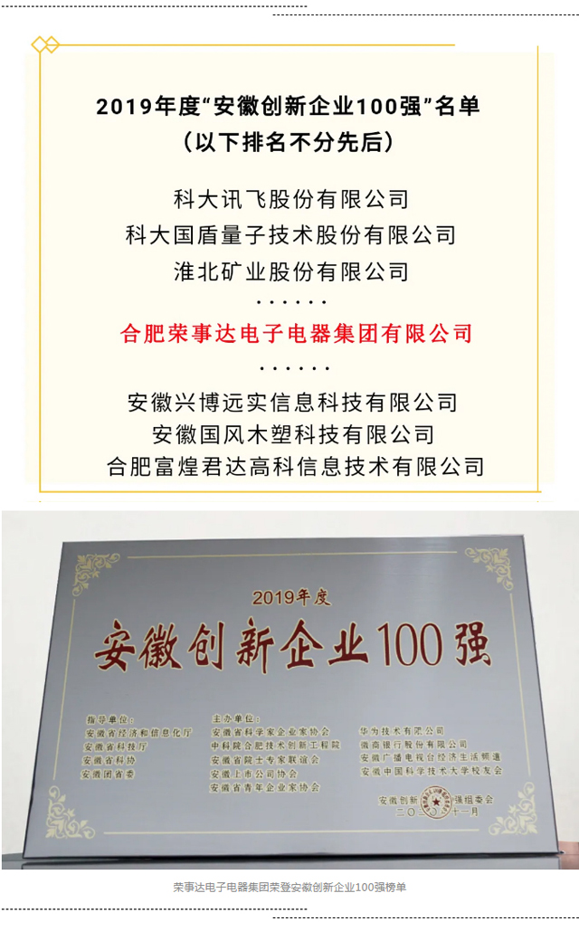 11月7日,由安徽省科學(xué)家企業(yè)家協(xié)會(huì )、中科院合肥技術(shù)創(chuàng )新工程院、安徽省院士專(zhuān)家聯(lián)誼會(huì )等聯(lián)合主辦的2019年度安徽創(chuàng )新企業(yè)100強發(fā)布及頒獎儀式順利舉行。會(huì )上,合肥榮事達電子電器集團有限公司榮登2019年度“安徽創(chuàng )新企業(yè)100強”榜單。
