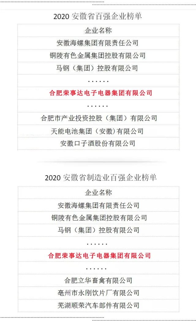 11月8日,2020安徽百強企業(yè)高峰論壇在銅陵市召開(kāi)。會(huì )上,安徽省企業(yè)聯(lián)合會(huì )第16次發(fā)布安徽百強企業(yè)榜單。合肥榮事達電子電器集團有限公司榮登2020安徽省百強企業(yè)榜單、2020安徽省制造業(yè)百強企業(yè)榜單。