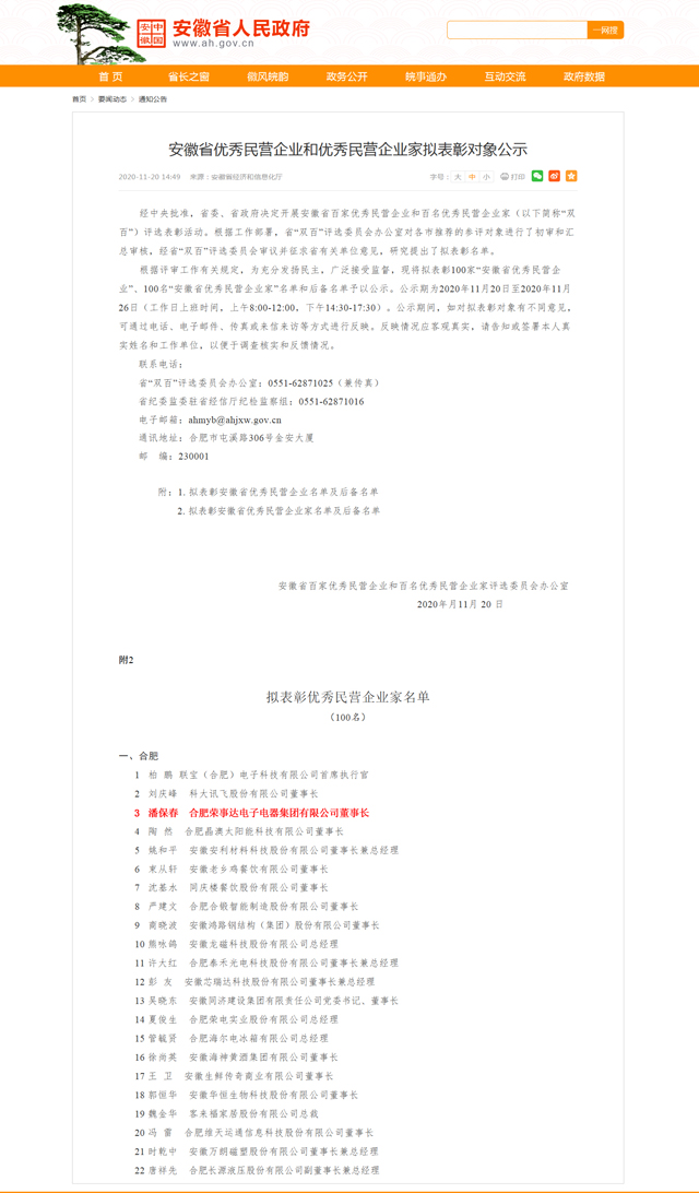 11月20日,安徽省百家優(yōu)秀民營(yíng)企業(yè)和百名優(yōu)秀民營(yíng)企業(yè)家擬表彰對象公示。合肥榮事達電子電器集團有限公司董事長(cháng)潘保春光榮上榜。
