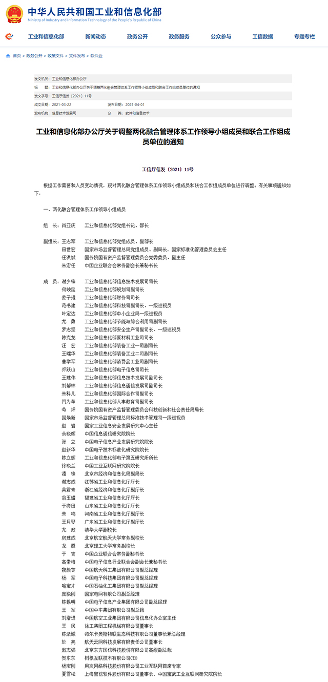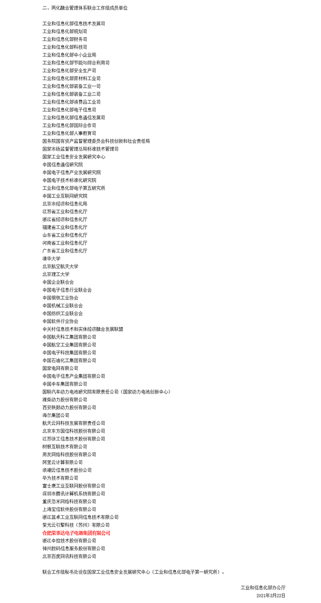 4月1日,工業(yè)和信息化部辦公廳發(fā)布《關(guān)于調整兩化融合管理體系工作領(lǐng)導小組成員和聯(lián)合工作組成員單位的通知》。榮事達當選為兩化融合管理體系聯(lián)合工作組成員單位。