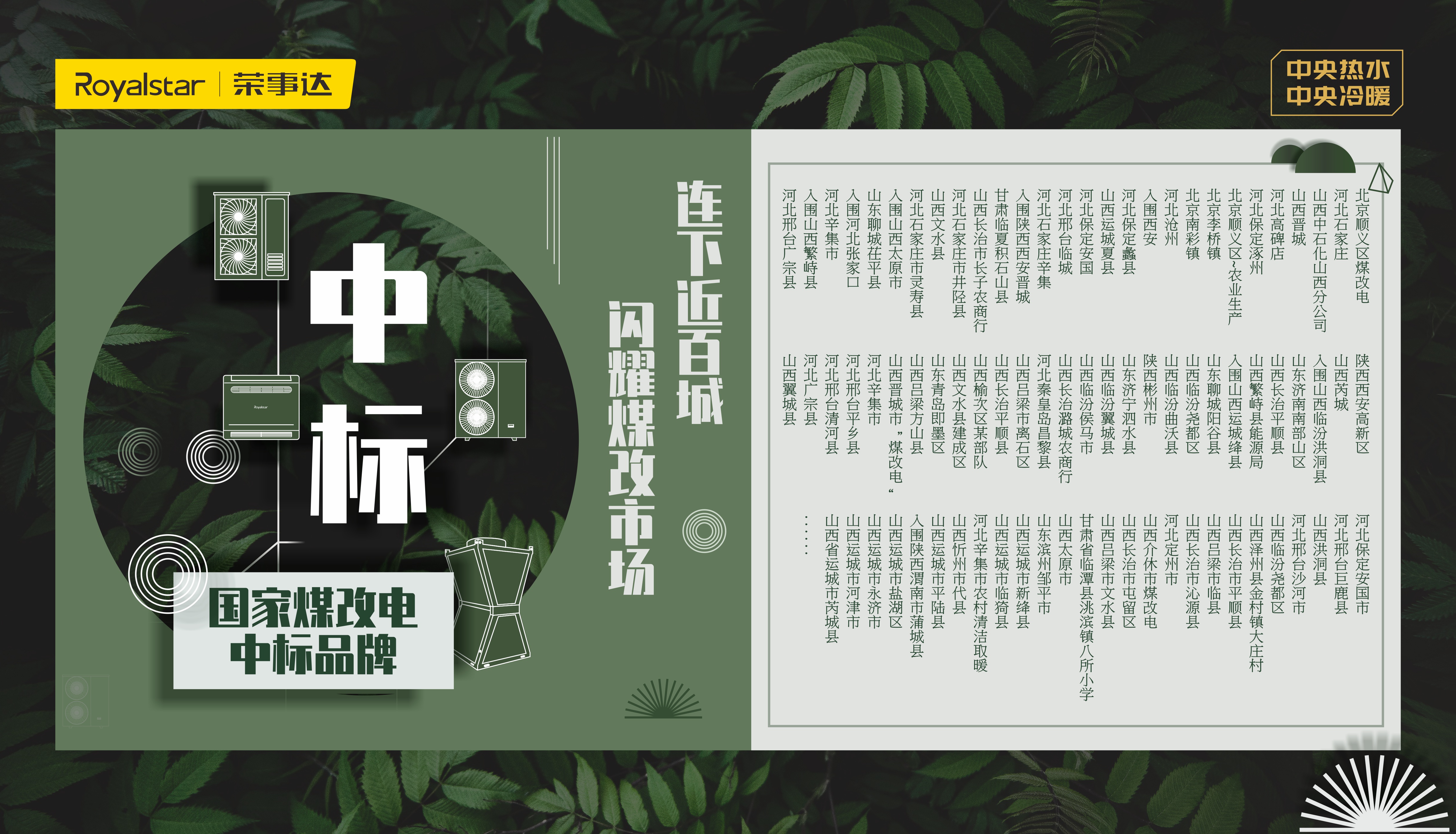 近年來(lái),榮事達空氣能先后中標近百個(gè)政府“煤改電”項目,僅2020年就中標38個(gè)省市、地區“煤改電”項目,清潔采暖再創(chuàng )佳績(jì)。從廣闊的平原到海拔4000米以上的世界屋脊;從冰雪覆蓋的北方高寒地區到溫暖濕潤的江南魚(yú)米之鄉;從囿于一家一戶(hù)的經(jīng)銷(xiāo)零售到大型集中商改項目,項目足跡布局全國各地。