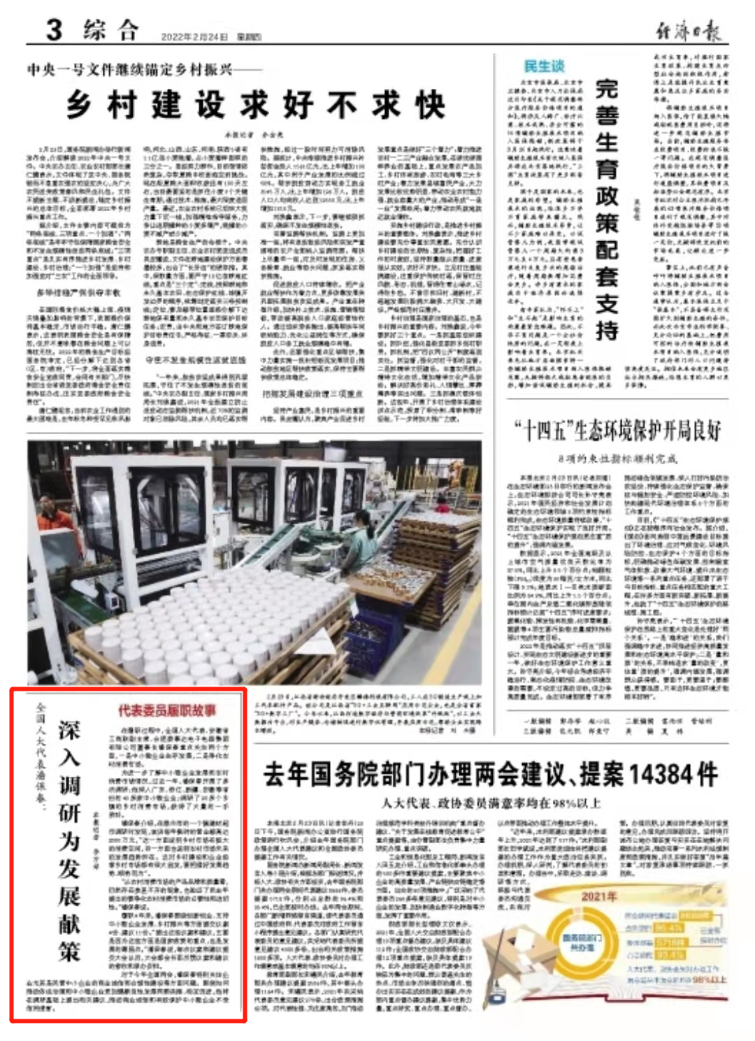 2月24日,經(jīng)濟日報數字報在《全國人大代表潘保春:深入調研為發(fā)展獻策》專(zhuān)題中,報道了全國人大代表、安徽省工商聯(lián)副主席、榮事達集團董事長(cháng)潘保春通過(guò)深入調研,為中小微企業(yè)發(fā)展和凈化農村消費市場(chǎng)建言獻策的重要舉措。