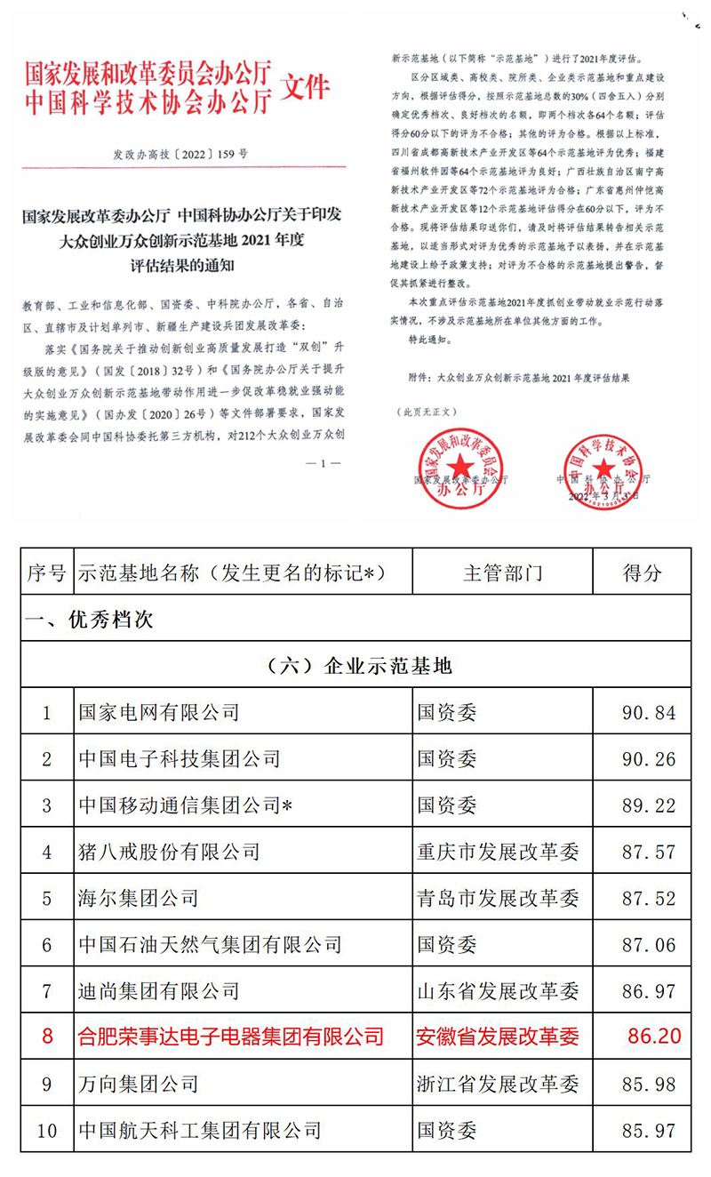近日,國家發(fā)展改革委辦公廳和中國科協(xié)辦公廳聯(lián)合發(fā)布了《關(guān)于印發(fā)大眾創(chuàng )業(yè)萬(wàn)眾創(chuàng )新示范基地2021年度評估結果的通知》,其中,榮事達國家雙創(chuàng )示范基地在本次評估過(guò)程中獲評“優(yōu)秀”等級。
