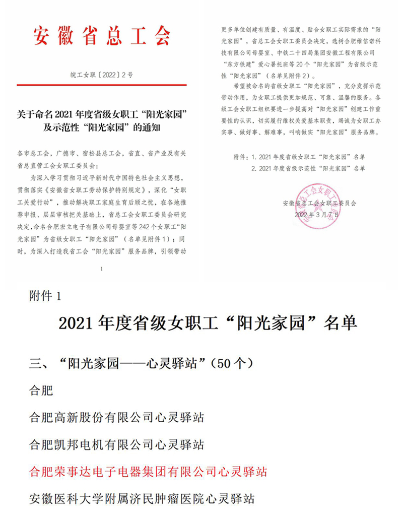 近日,安徽省總工會(huì )印發(fā)《關(guān)于命名 2021 年度省級女職工“陽(yáng)光家園” 及示范性“陽(yáng)光家園”的通知》,共命名了242個(gè)省級女職工“陽(yáng)光家園”,其中榮事達集團女職工陽(yáng)光家園——心靈驛站獲評2021年度省級女職工“陽(yáng)光家園”。