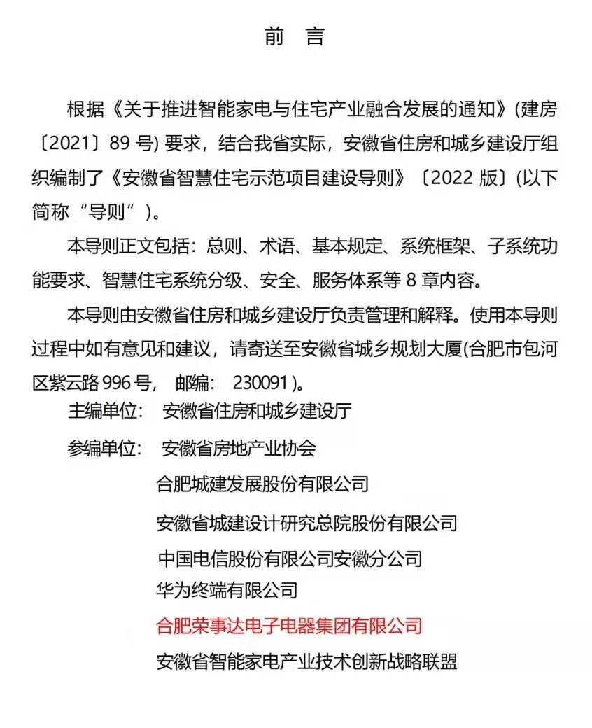 據了解,本次宣貫的《安徽省智慧住宅示范項目建設導則(2022年版)》,是由榮事達參與編制的安徽省首個(gè)智慧住宅示范項目建設導則,是省住房和城鄉建設廳對榮事達在智能家居領(lǐng)域綜合實(shí)力的充分肯定。作為智能家居行業(yè)的標志性企業(yè),榮事達積極參與政府標準化活動(dòng),為行業(yè)發(fā)展貢獻了越來(lái)越多的“榮事達力量”。