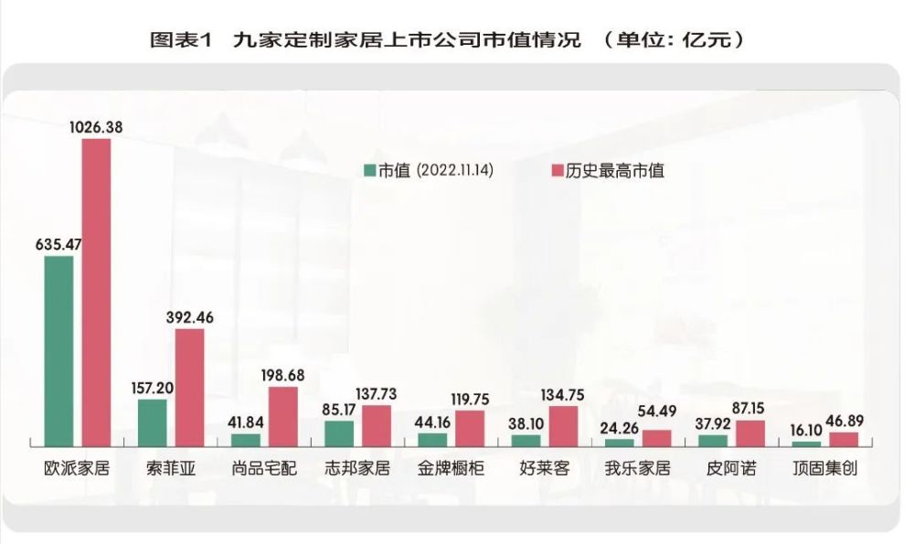以2022年11月14日為觀(guān)察時(shí)間點(diǎn),九家定制家居上市公司的市值表現,并不理想(表1)。