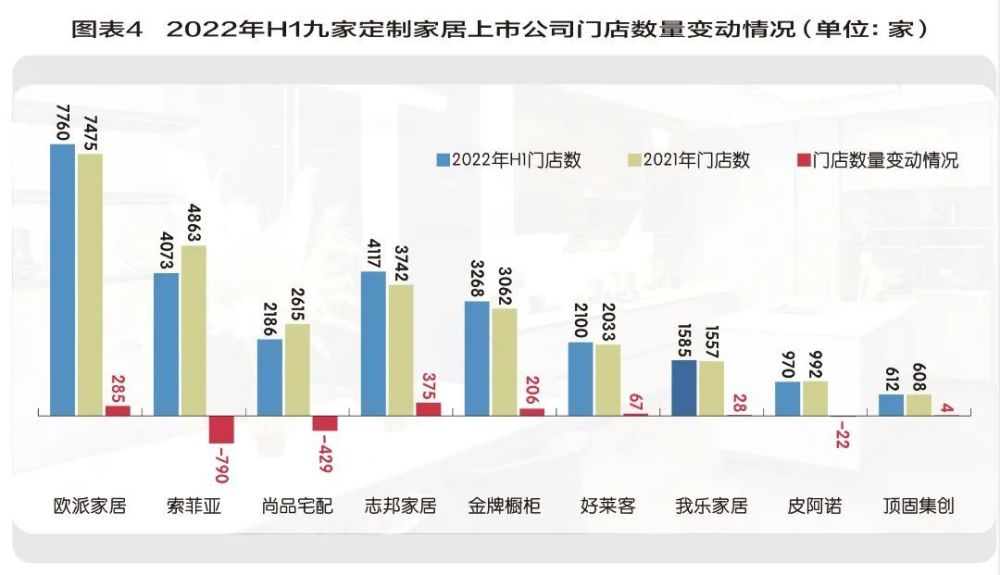 但是,根據對比2021年底和2022年上半年的門(mén)店情況,除了歐派家居、志邦家居、金牌櫥柜出現擴增200家以上門(mén)店之外,好萊客、我樂(lè )家居、頂固集創(chuàng )表現得相對保守,而索菲亞、尚品宅配、皮阿諾則出現了關(guān)店潮——三家中,索菲亞消失了790家、尚品宅配消失了429家、皮阿諾消失了22家(表4)。