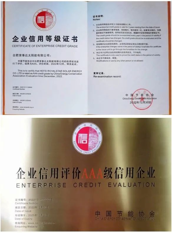 其中,榮事達集團旗下項目單位——合肥榮事達太陽(yáng)能有限公司,憑借其雄厚的企業(yè)實(shí)力、卓越的管理水平以及較高的商業(yè)信用,獲頒企業(yè)AAA信用等級證書(shū),這是在企業(yè)信用評價(jià)等級中的最高等級認證。