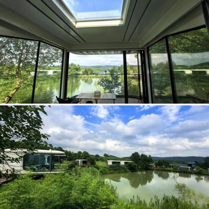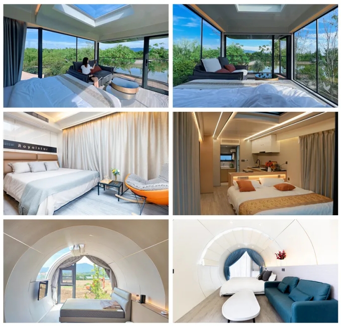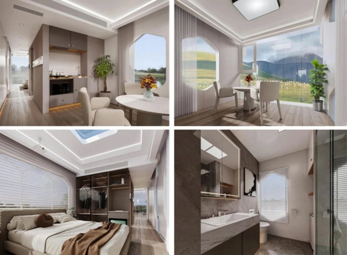 打開(kāi)艙門(mén),仿佛邁入另一個(gè)世界,這里臥室、會(huì )客廳、衛生間、活動(dòng)室布置精巧,門(mén)窗、燈飾、窗簾、電視均為智能化聲控;270度全景落地窗,讓你擁萬(wàn)頃花海而睡,枕夜幕繁星而眠;拉上窗簾,一鍵放下投影儀,調好燈光,躺在床上,開(kāi)啟屬于自己的愜意時(shí)光。