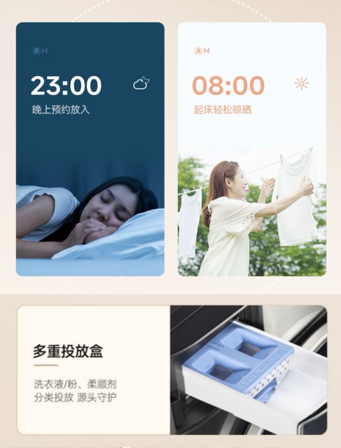 榮事達大薄系列滾筒洗衣機(XQG120-18DQ)配置了多重投放盒,實(shí)現洗衣粉/洗衣液、柔順劑的分類(lèi)投放,從源頭守護愛(ài)衣。貼心提供24小時(shí)超長(cháng)預約定制洗滌功能,精準控制洗衣時(shí)間,可以讓用戶(hù)更加合理的安排時(shí)間,確保衣物在需要的時(shí)間內洗好。工作一天回到家,再也不用睡眼惺忪的等待晾曬衣物了!