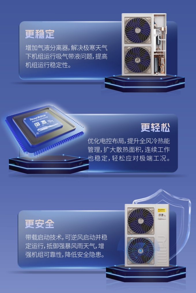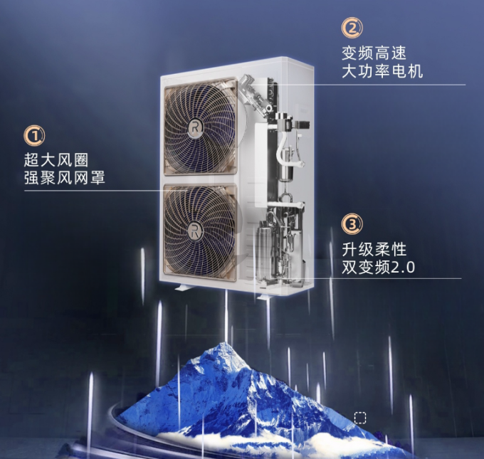 榮事達空氣能御雪pro系列宛如一位性能強悍的 “能源精靈”,其擁有的變頻技術(shù)就像一個(gè)智能的指揮中心,能輕松實(shí)現無(wú)級調速。無(wú)論是炎炎夏日的制冷需求,還是寒冷冬日的制熱考驗,它都能從容應對。這種在冷暖之間自由切換且表現出眾的能力,為用戶(hù)帶來(lái)了全年舒適的使用體驗。而新一代直流無(wú)刷電機的應用更是讓整個(gè)系列產(chǎn)品錦上添花。一方面,它宛如一位安靜的守護者,控制運行噪音。另一方面,它就像一個(gè)精準的舵手,高精度控制機組運行,確保設備在各種工況下都能穩定、高效地運行。