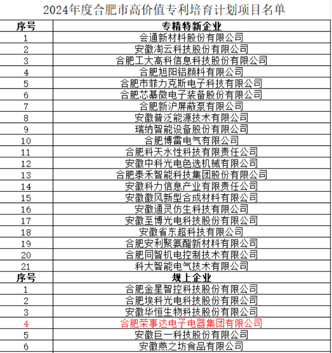近日,合肥市市場(chǎng)監督管理局公布了2024年度合肥市高價(jià)值專(zhuān)利培育計劃項目名單,合肥榮事達電子電器集團有限公司成功入選并獲得項目立項。