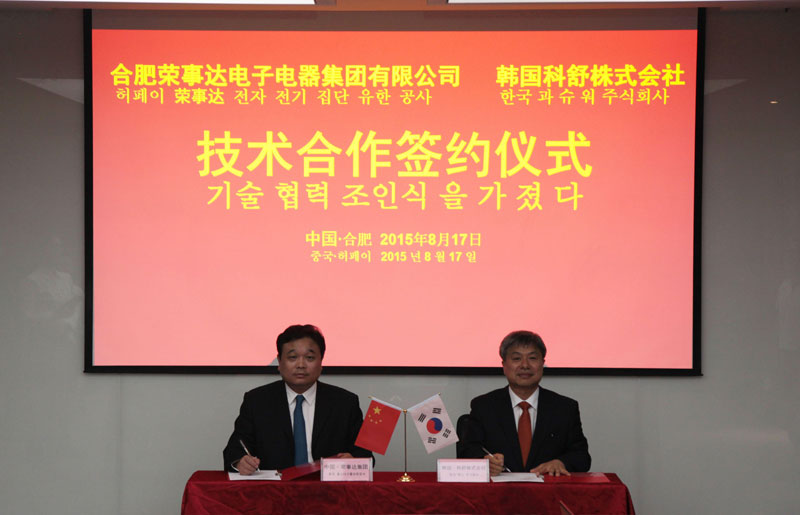 17號下午14:30,韓國科舒株式會(huì )社社長(cháng)豐弼元、常務(wù)李春山與榮事達電子電器集團董事長(cháng)潘保春、常務(wù)副總裁馬睿、榮事達電子電器集團有限公司總經(jīng)理張麗蘋(píng)準時(shí)出席簽約儀式。董事長(cháng)潘保春代表公司對韓國合作伙伴的到來(lái)表示最熱烈的歡迎。
