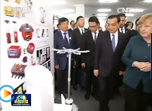 李克強與默克爾在榮事達展品前駐足觀(guān)看(新聞聯(lián)播畫(huà)面)