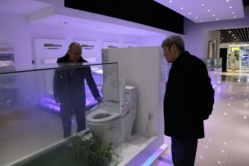 集團常務(wù)副總裁馬睿向李洪峰展示智能潔身器的使用方法和各種智能化功能。