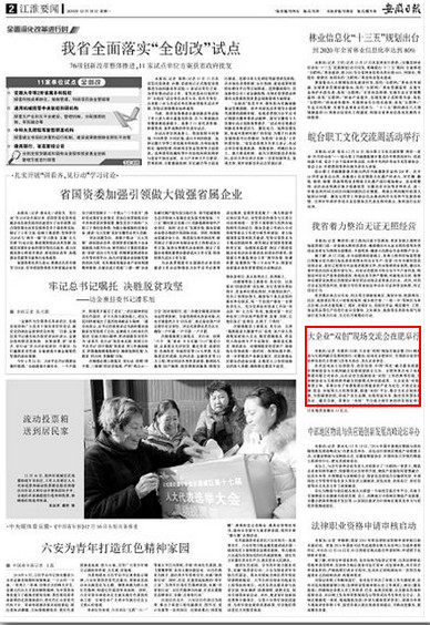 12月19日,安徽省委機關(guān)報《安徽日報》以大企業(yè)“雙創(chuàng )”現場(chǎng)交流會(huì )在肥舉行為題,專(zhuān)題報道了由國家工信部指導、榮事達獨家承辦的全國大企業(yè)“雙創(chuàng )”現場(chǎng)交流會(huì )活動(dòng),報道中指出:榮事達電子電器集團以智能家居產(chǎn)業(yè)為定位,開(kāi)放企業(yè)品牌、資金、市場(chǎng)等九大優(yōu)勢資源,搭建“雙創(chuàng )”平臺;整合全社會(huì )創(chuàng )客資源,分段精準扶持;形成產(chǎn)業(yè)生態(tài)圈,實(shí)現利益共享,做法受到國務(wù)院肯定。