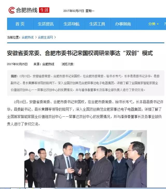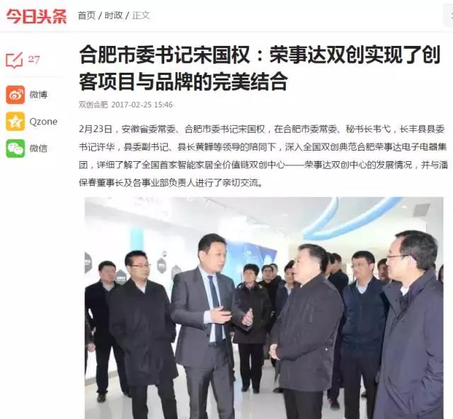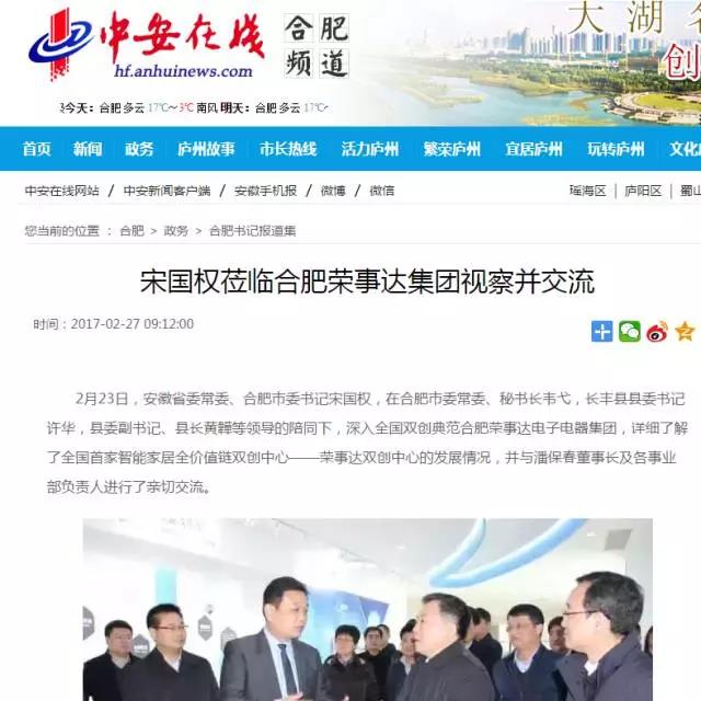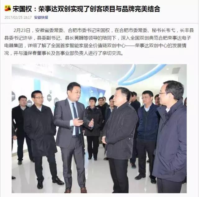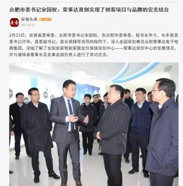 2月23日,安徽省委常委、合肥市委書(shū)記宋國權,在合肥市委常委、秘書(shū)長(cháng)韋弋,長(cháng)豐縣縣委書(shū)記許華,縣委副書(shū)記、縣長(cháng)黃韡等領(lǐng)導的陪同下,深入全國雙創(chuàng )典范合肥榮事達電子電器集團,詳細了解了全國首家智能家居全價(jià)值鏈雙創(chuàng )中心——榮事達雙創(chuàng )中心的發(fā)展情況,并與潘保春董事長(cháng)及各事業(yè)部負責人進(jìn)行了親切交流。