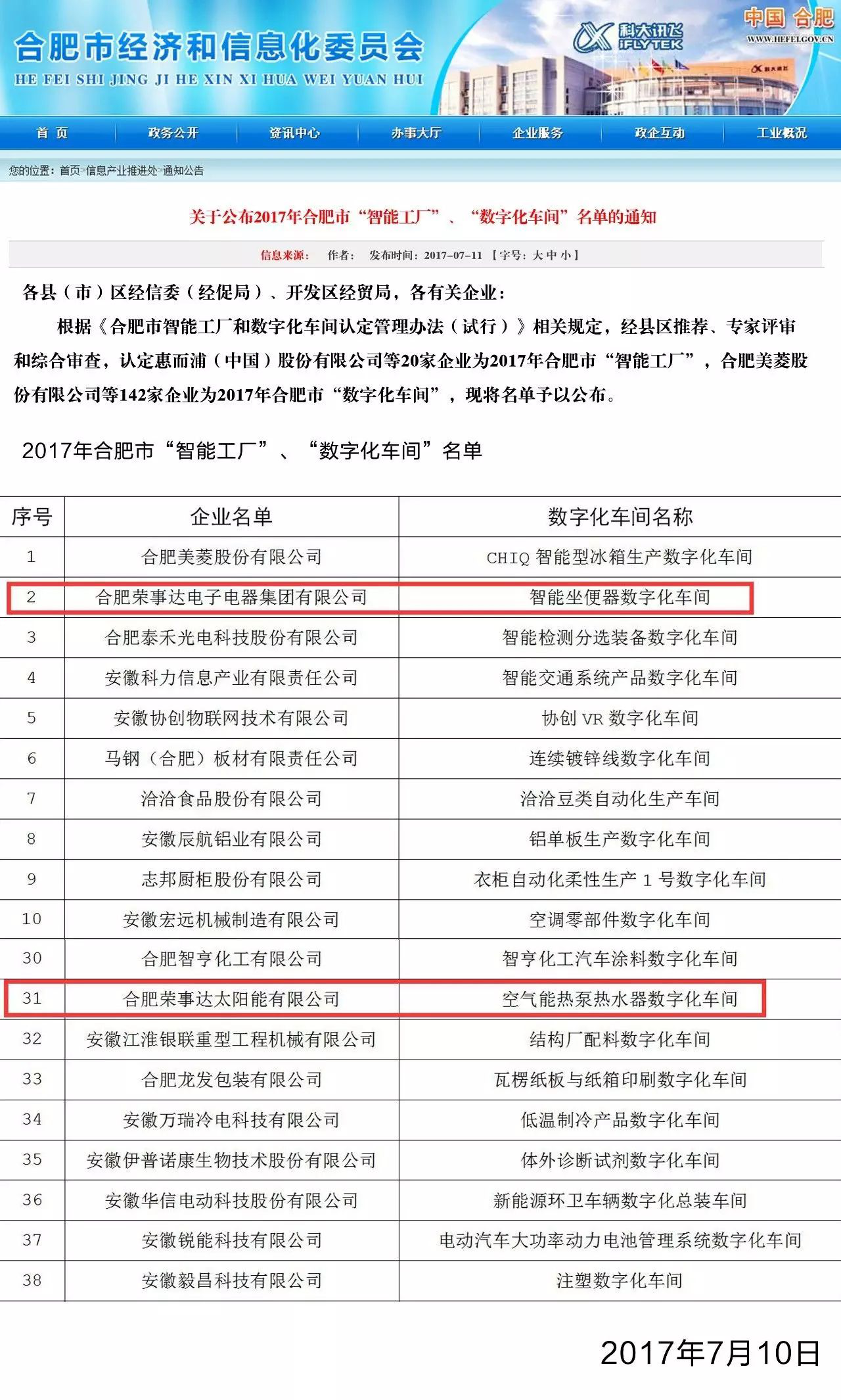 7月11日,合肥市經(jīng)濟與信息化委員會(huì )公布《2017年合肥市“智能工廠(chǎng)”、“數字化車(chē)間”名單》。