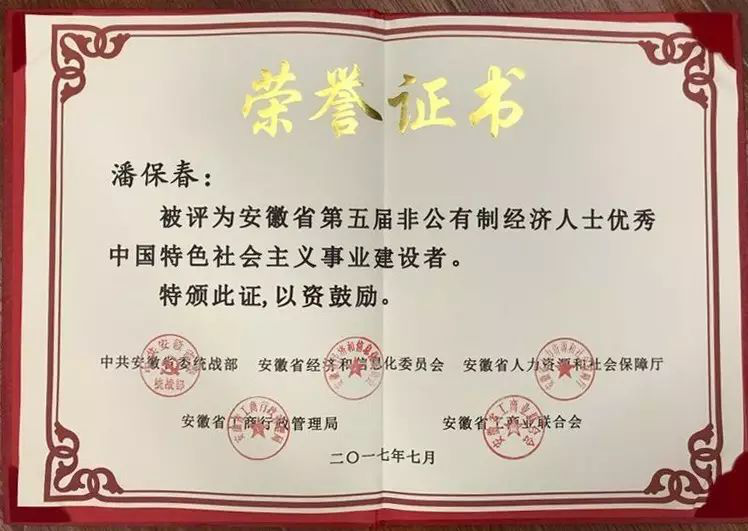 潘保春董事長(cháng)當選安徽省工商聯(lián)副主席 并榮獲“安徽省第五屆優(yōu)秀中國特色社會(huì )主義事業(yè)建設者”稱(chēng)號