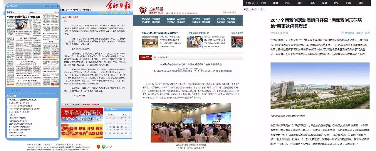 2017年全國雙創(chuàng )活動(dòng)周于9月15日盛大啟動(dòng),并在全國各地設立分會(huì )場(chǎng)。在安徽合肥分會(huì )場(chǎng),合肥榮事達電子電器集團大放異彩,成為雙創(chuàng )活動(dòng)周現場(chǎng)一道亮麗的風(fēng)景線(xiàn)!逗戏嗜請蟆、《工商導報》、搜狐網(wǎng)等主流媒體對榮事達在雙創(chuàng )活動(dòng)周上的精彩表現進(jìn)行了相關(guān)報道。