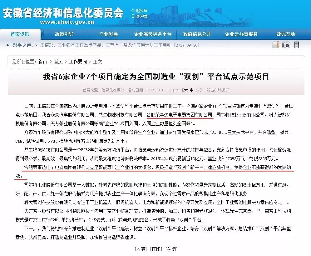 日前,工信部在全國范圍內開(kāi)展2017年制造業(yè)“雙創(chuàng )”平臺試點(diǎn)示范項目申報工作,安徽省6家企業(yè)7個(gè)項目被確定為制造業(yè)“雙創(chuàng )”平臺試點(diǎn)示范項目。其中,合肥榮事達電子電器集團有限公司成功入圍。