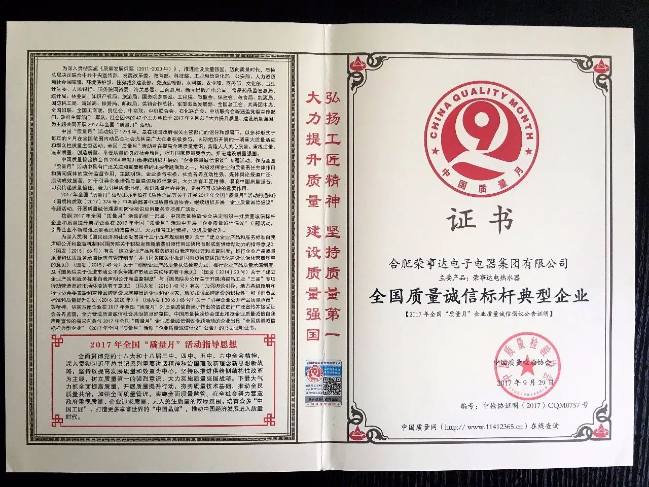 在近期的全國“質(zhì)量月”期間,憑借榮事達電熱水器系列產(chǎn)品的優(yōu)異表現,榮事達電子電器集團榮獲“全國質(zhì)量誠信標桿典型企業(yè)”認證。這是繼“全國質(zhì)量檢驗穩定合格產(chǎn)品”和“全國質(zhì)量信得過(guò)產(chǎn)品”之后,榮事達電熱水器在全國“質(zhì)量月”期間所獲得的又一重磅殊榮。