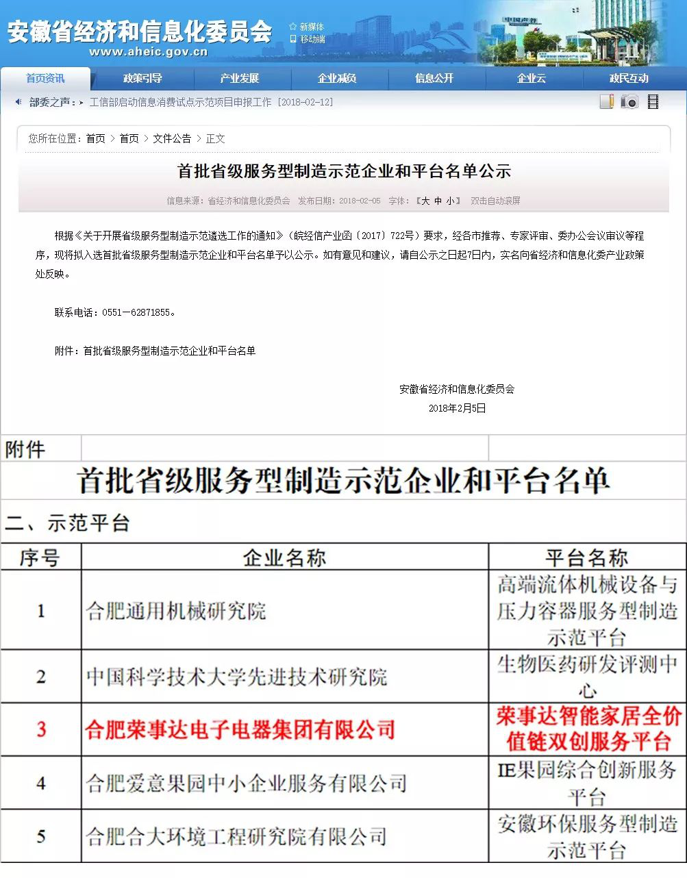 近期,安徽省經(jīng)信委公布了首批省級服務(wù)型制造示范企業(yè)和平臺公示名單。榮事達電子電器集團旗下的榮事達智能家居全價(jià)值鏈雙創(chuàng )服務(wù)平臺,在本次評選中成功入選首批省級服務(wù)型制造示范平臺公示名單,并順利通過(guò)公示。