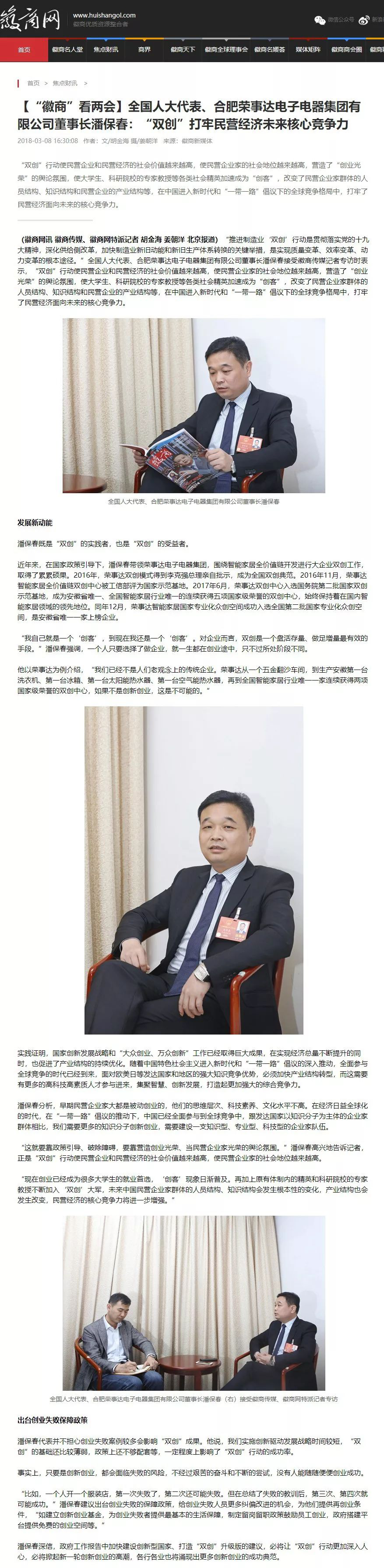 ◆ 3月8日,安徽日報報業(yè)集團旗下徽商網(wǎng)《“徽商”看兩會(huì )》欄目刊發(fā)對潘保春董事長(cháng)專(zhuān)訪(fǎng)——《全國人大代表、合肥榮事達電子電器集團有限公司董事長(cháng)潘保春:“雙創(chuàng )”打牢民營(yíng)經(jīng)濟未來(lái)核心競爭力》。