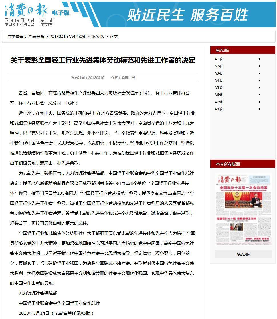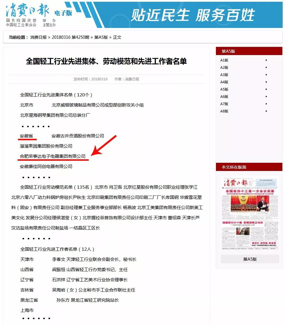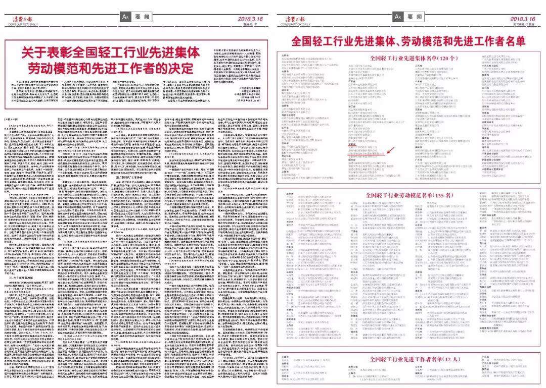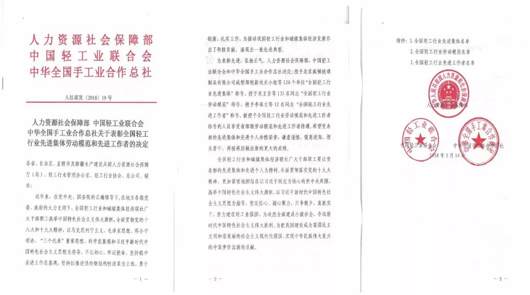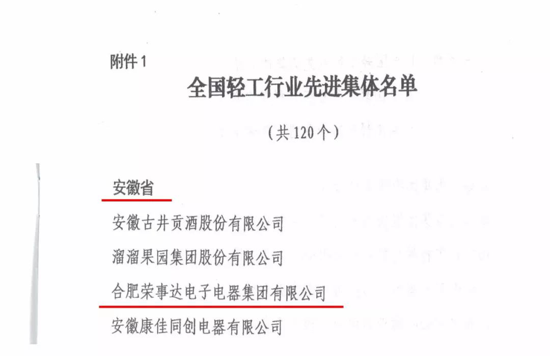 2017年,是榮事達收獲榮譽(yù)和肯定最多的一年。2018年3月16日,榮事達再傳喜訊:我們被人社部、中國輕工業(yè)聯(lián)合會(huì )、及中華全國手工業(yè)合作總社聯(lián)合評為“全國輕工行業(yè)先進(jìn)集體”,成為安徽省四家入圍單位之一,合肥市唯一一家入圍企業(yè)。