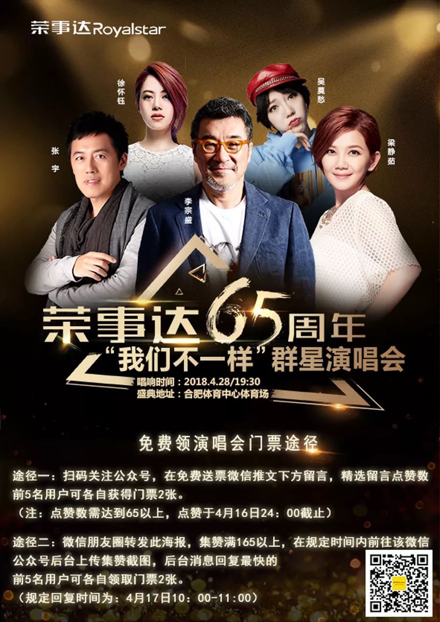 4月28日,他們來(lái)啦!榮事達65周年“我們不一樣”群星演唱會(huì )激情開(kāi)唱。榮事達獻禮每一個(gè)不甘平凡的人,演唱會(huì )門(mén)票任性送!詳情請看下方海報!