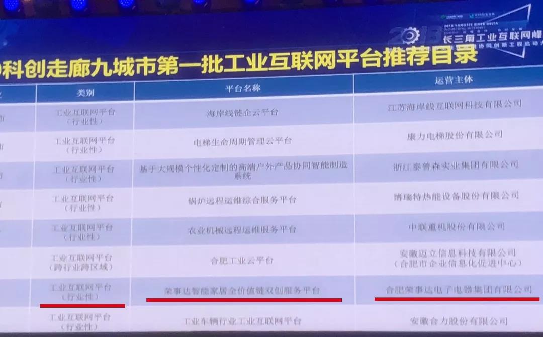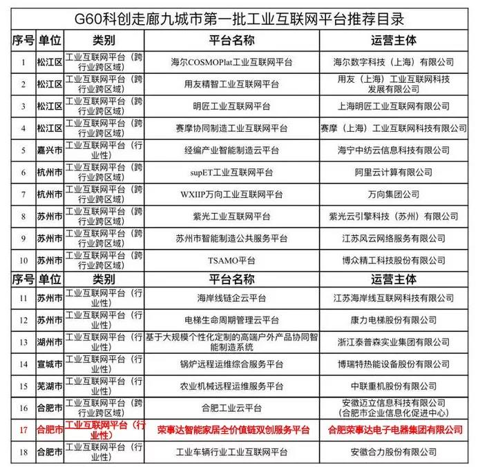 大會(huì )期間,《G60科創(chuàng )走廊九城市第一批工業(yè)互聯(lián)網(wǎng)平臺和專(zhuān)業(yè)服務(wù)機構推薦目錄》發(fā)布。合肥榮事達電子電器集團有限公司獨立打造并運營(yíng)的“榮事達智能家居全價(jià)值鏈雙創(chuàng )服務(wù)平臺”榮登榜單,成為行業(yè)性工業(yè)互聯(lián)網(wǎng)平臺。