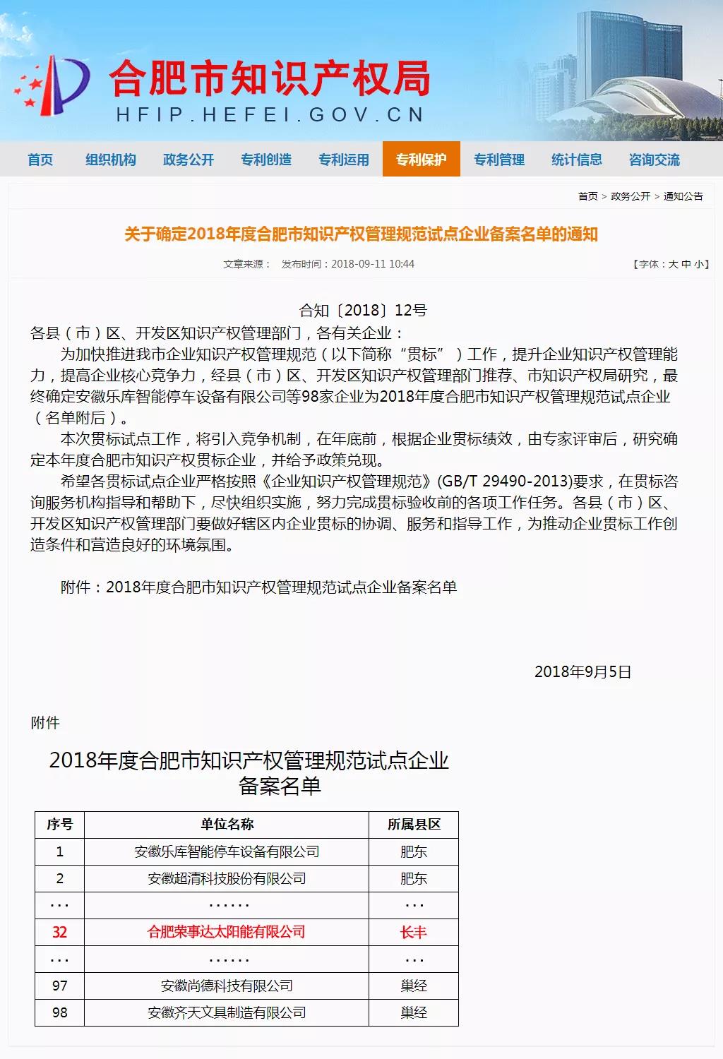 合肥榮事達太陽(yáng)能有限公司獲評“2018年度合肥市知識產(chǎn)權管理規范試點(diǎn)企業(yè)”
