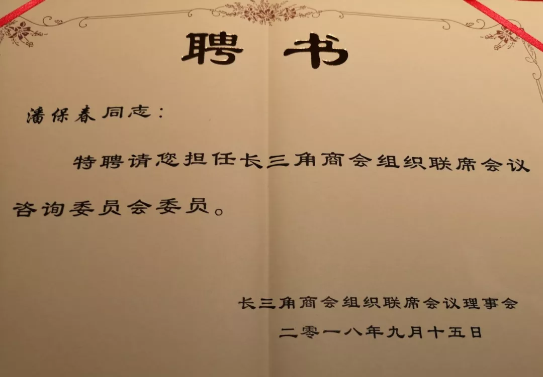 長(cháng)三角商會(huì )組織聯(lián)席會(huì )議理事會(huì )為集團董事長(cháng)潘保春頒發(fā)咨詢(xún)委員會(huì )委員聘書(shū)