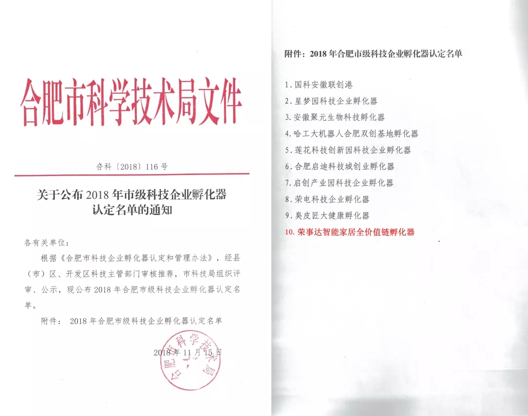 近日,合肥市科技局發(fā)布了《關(guān)于2018年市級科技企業(yè)孵化器認定結果的公示》,榮事達智能家居全價(jià)值鏈孵化器成功獲得市級科技企業(yè)孵化器的認定。