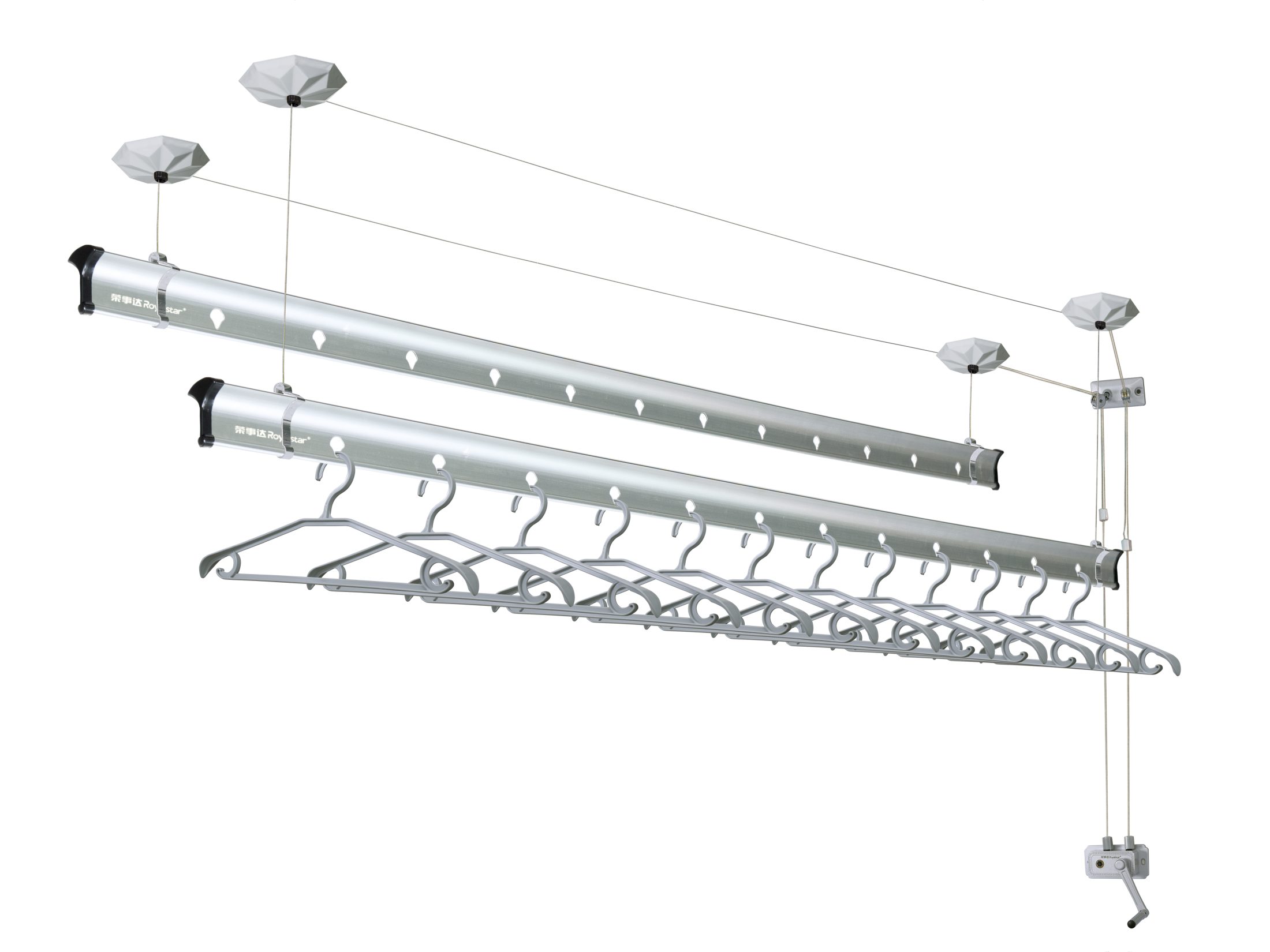 產(chǎn)品名稱(chēng):手搖晾衣架 產(chǎn)品型號:RSD-7001S 頂座:寶石花 轉角器:吉祥大方 鋼絲繩:304/1.5 衣?lián)危焊邚姸人芰弦聯(lián)?br /> 晾桿參數:2桿、24個(gè)防風(fēng)掛孔 晾桿:銀白太空鋁扇形桿 手搖器:小花邊